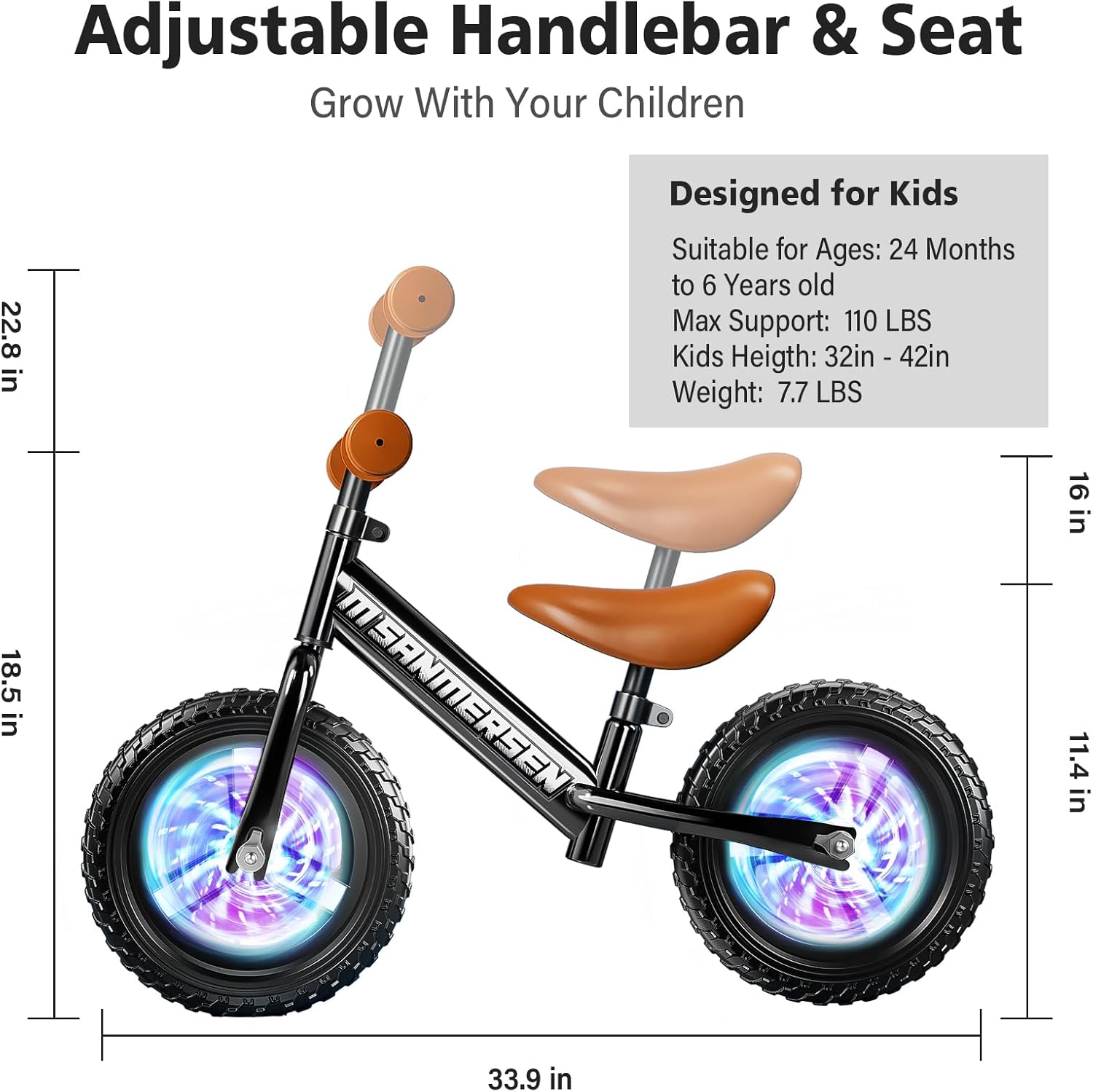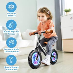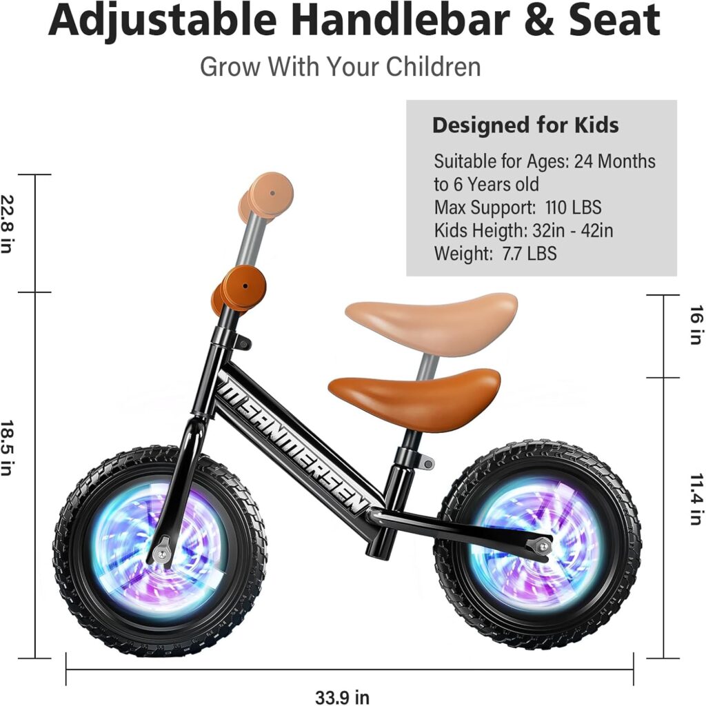 Bicicleta de Balance sin Pedales 12” con Luces LED – Para Niños de 2 a 5 Años, Liviana y Ajustable con Ruedas Iluminadas, Asiento y Manubrio Regulables