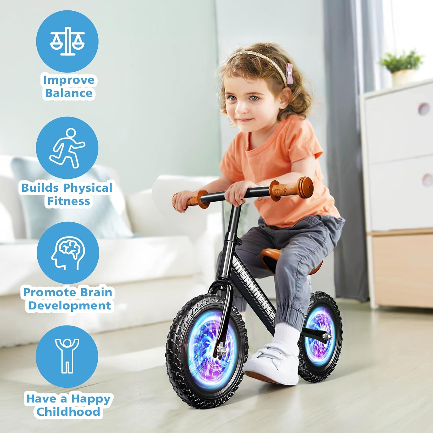 La bicicleta de balance sin pedales de 12 pulgadas con ruedas luminosas es el juguete ideal para que niños y niñas de 2 a 5 años desarrollen equilibrio, coordinación y confianza antes de pasar a una bicicleta tradicional.