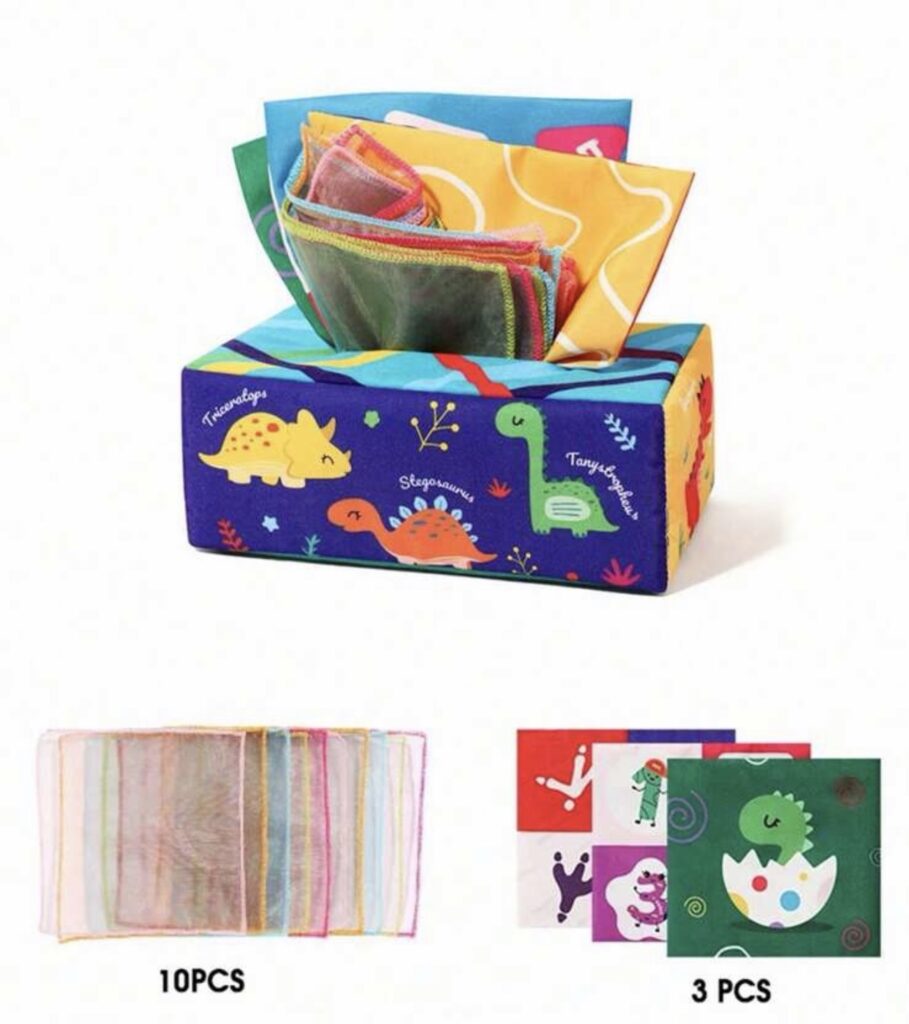 Caja de Pañuelos Sensorial para Bebé Montessori – Juguete Educativo de Estimulación Temprana con Telas y Papel Crujiente, dinosaurios