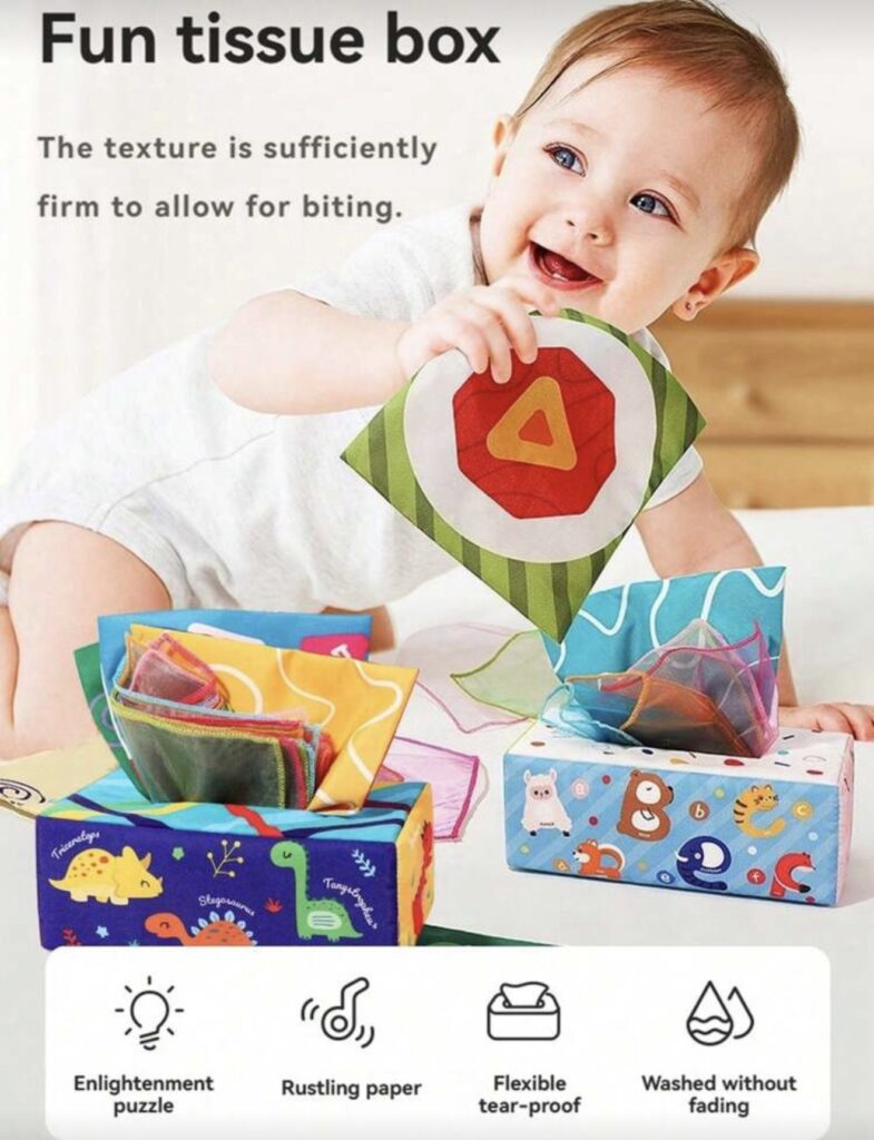 La Caja de Pañuelos Sensorial para Bebé es un juguete educativo inspirado en la metodología Montessori, diseñado para estimular los sentidos y el desarrollo temprano desde los primeros meses de vida.