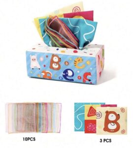 Incluye una caja suave de tela con divertidos diseños de animales, números y formas, junto con pañuelos de tela de colores y pañuelos con papel crujiente, ideales para que el bebé los saque, explore y vuelva a introducir, fortaleciendo la coordinación mano-ojo y la motricidad fina.