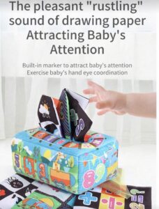 Incluye una caja suave de tela acolchada con diseños coloridos y 12 pañuelos ligeros y suaves, ideales para el juego sensorial. Los pañuelos producen un agradable sonido al manipularlos, captando la atención del bebé y fomentando la curiosidad natural.