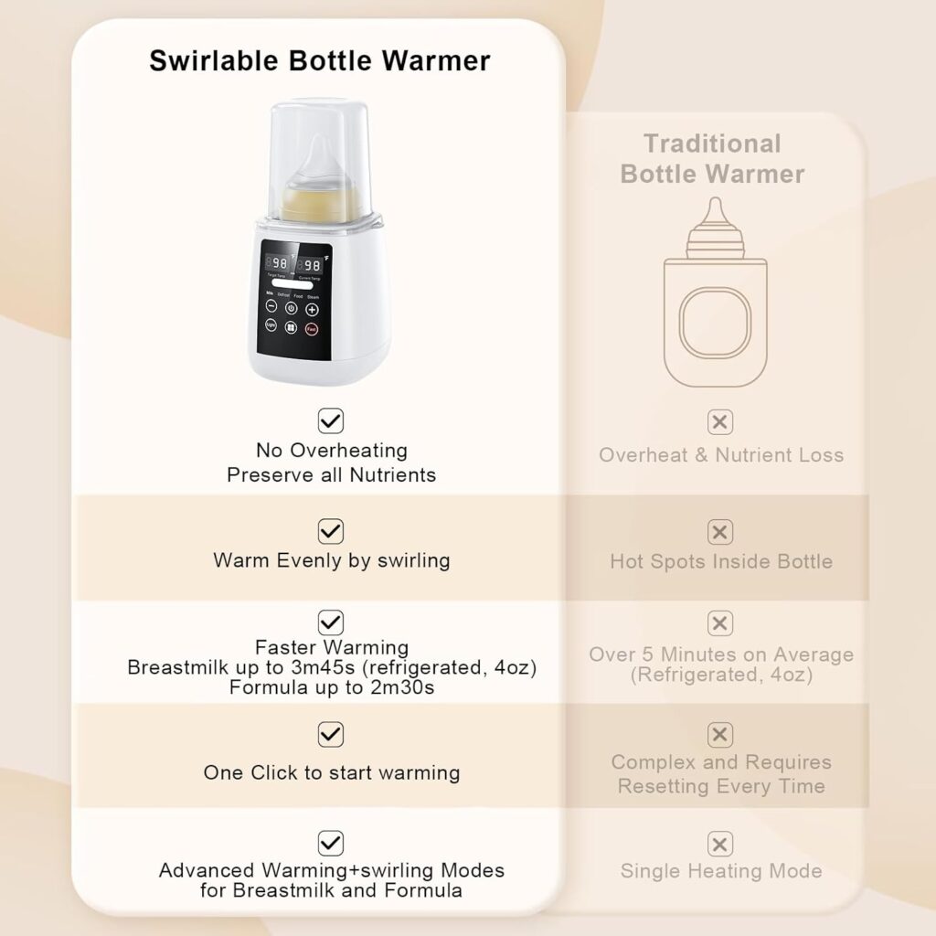 Gracias a su sistema de calentamiento por vapor con control preciso de temperatura, calienta el biberón en solo 3 a 5 minutos, ideal para tomas nocturnas. Su pantalla LED inteligente muestra la temperatura en tiempo real y facilita un uso sencillo incluso de noche gracias a su luz nocturna suave.