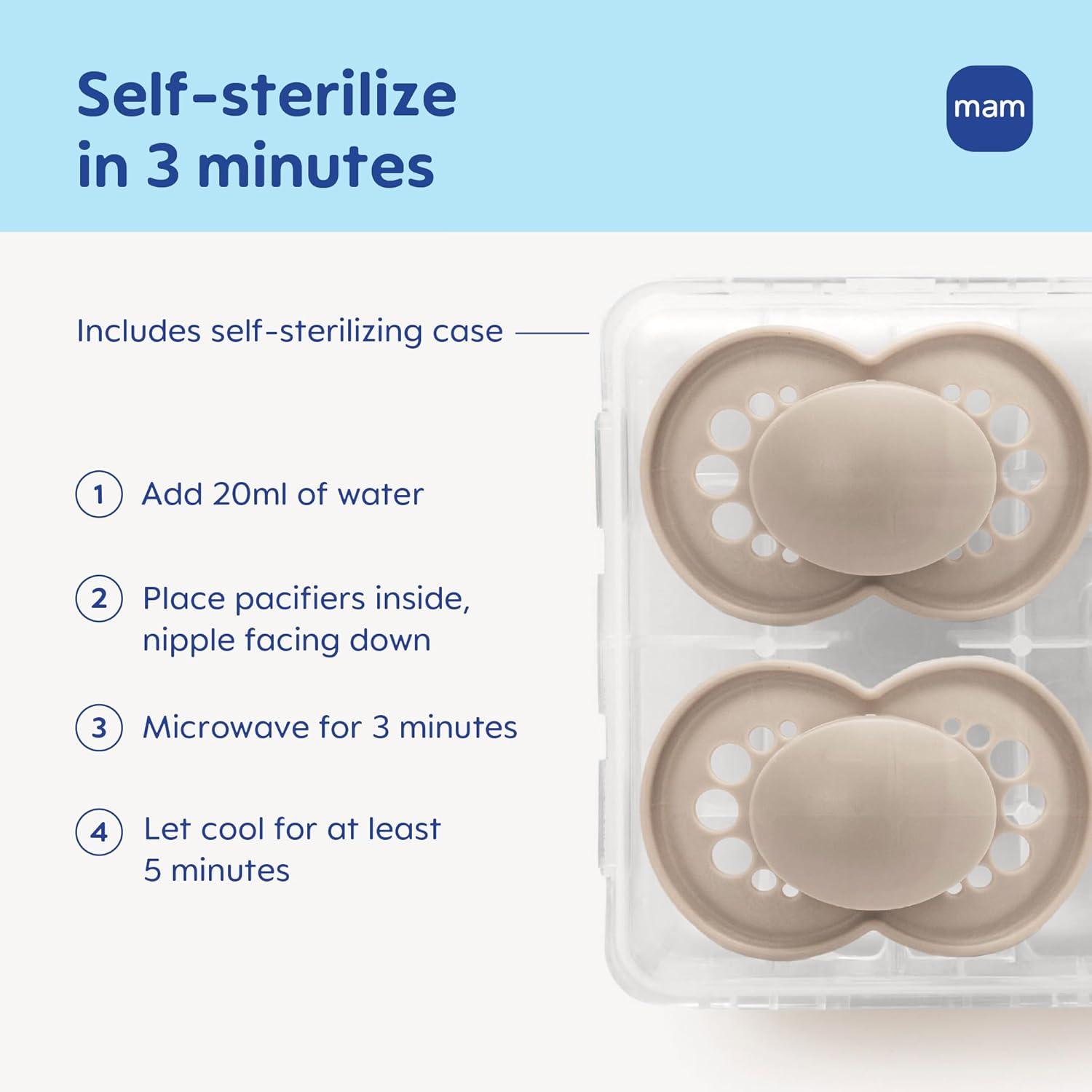 Cada set incluye un estuche esterilizador, que permite esterilizar el chupón en solo 3 minutos, ideal para mantenerlo limpio tanto en casa como cuando estás fuera.