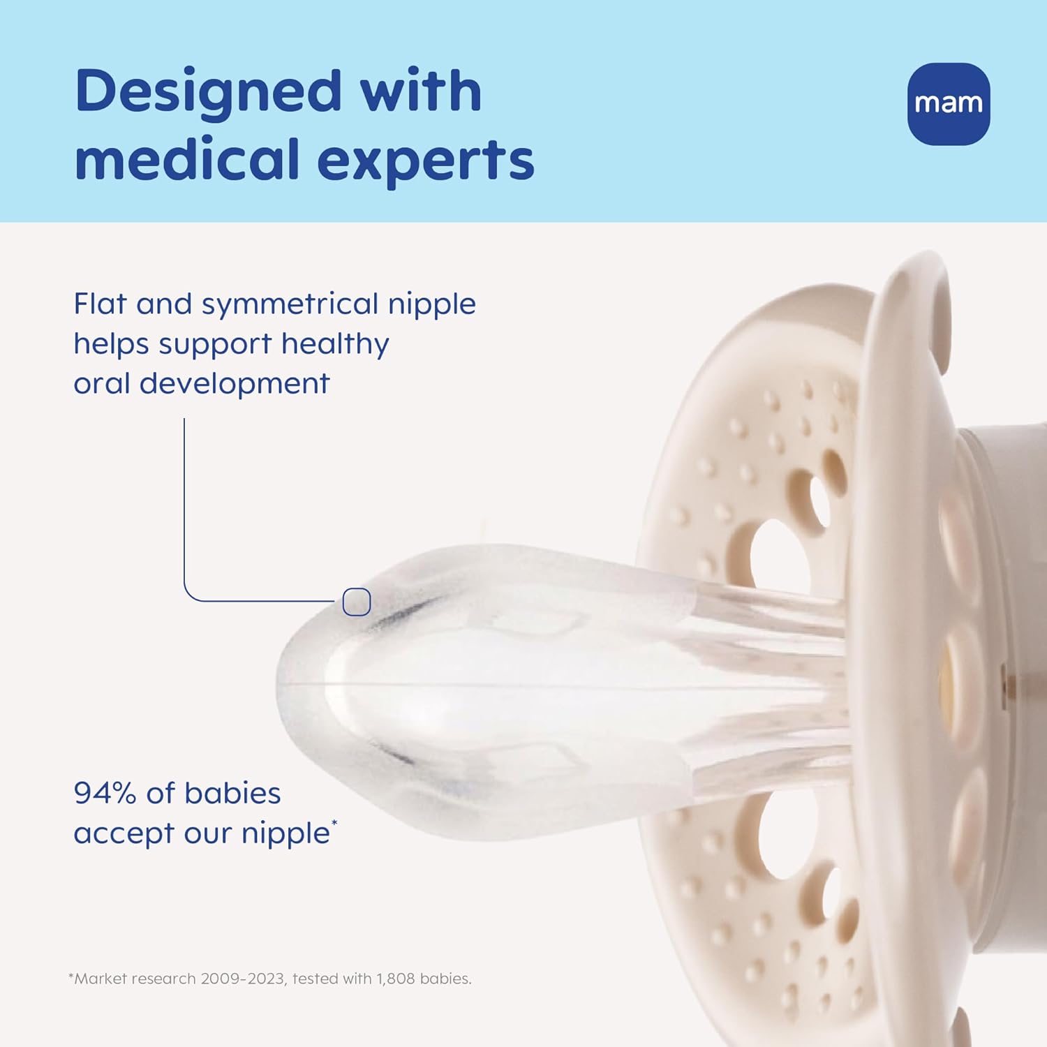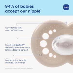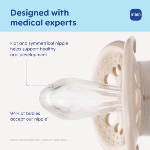 Su tetina de silicona médica SkinSoft™, extra suave y flexible, tiene una textura similar al pecho materno, lo que facilita su aceptación tanto en bebés que toman pecho como biberón. Además, su diseño especial permite que la tetina se adapte naturalmente a la boca del bebé al succionar, apoyando un patrón de succión más natural.