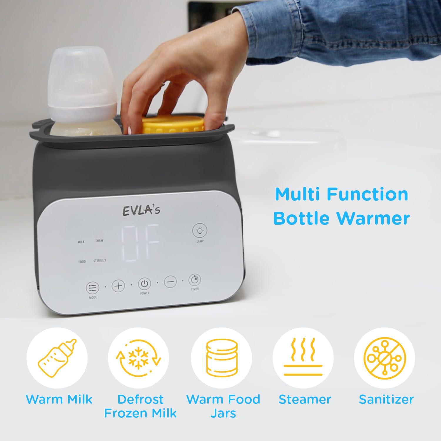 El EVLA’S Baby Bottle Warmer combina diseño moderno con tecnología eficiente para facilitar tu rutina, tanto de día como de noche.