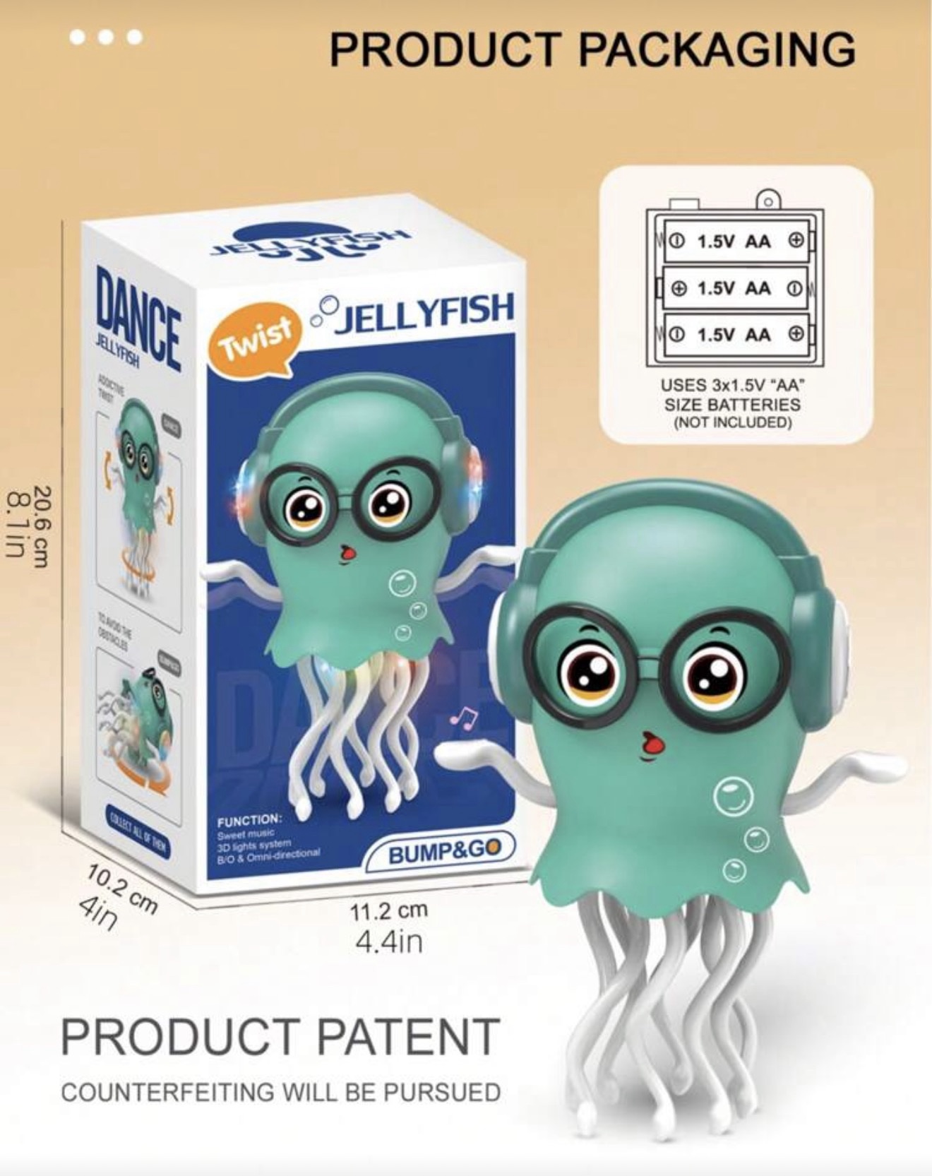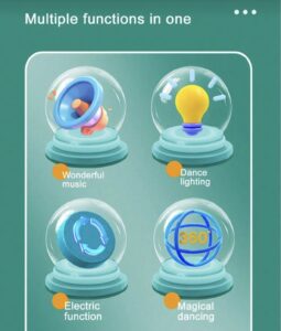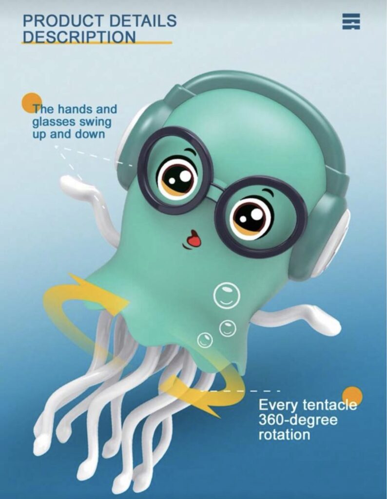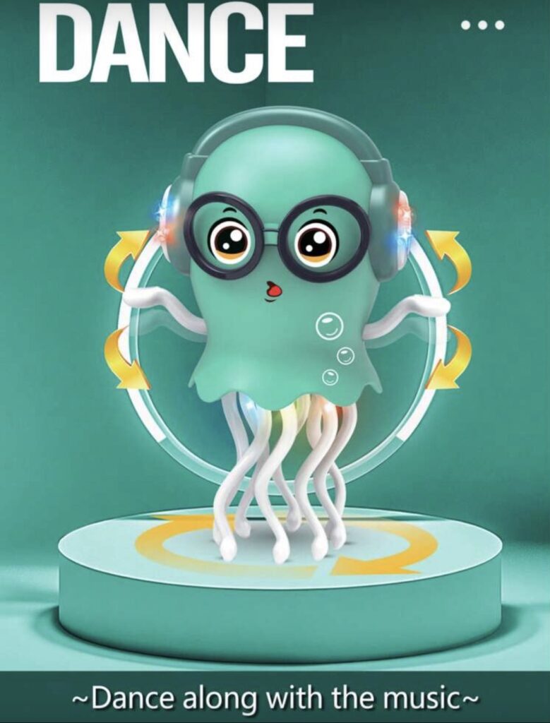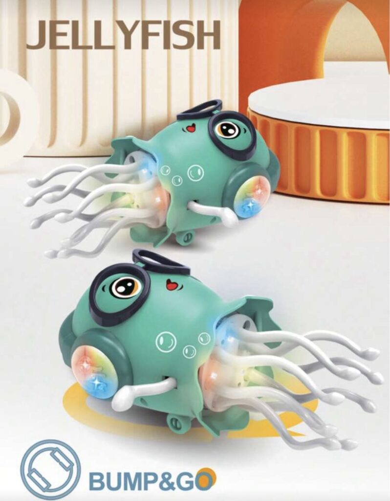 La medusa baila, gira y se arrastra automáticamente, mientras sus tentáculos se mueven en rotación de 360°, creando un efecto visual llamativo. Gracias a su sensor inteligente de obstáculos, cambia de dirección al detectar objetos, lo que la hace ideal para el juego en el piso.