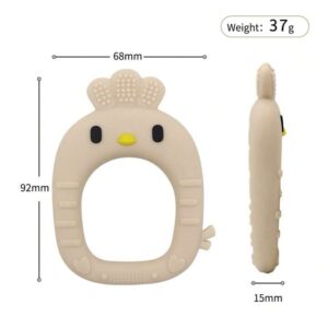 Diversión, alivio y ternura en un solo juguete! Este adorable mordedor de silicona con forma de pollito está diseñado especialmente para calmar las encías de tu bebé durante la etapa de dentición. Incluye una práctica pulsera de mano con dibujos animados, ideal para que el bebé lo sujete fácilmente y lo lleve a todas partes.