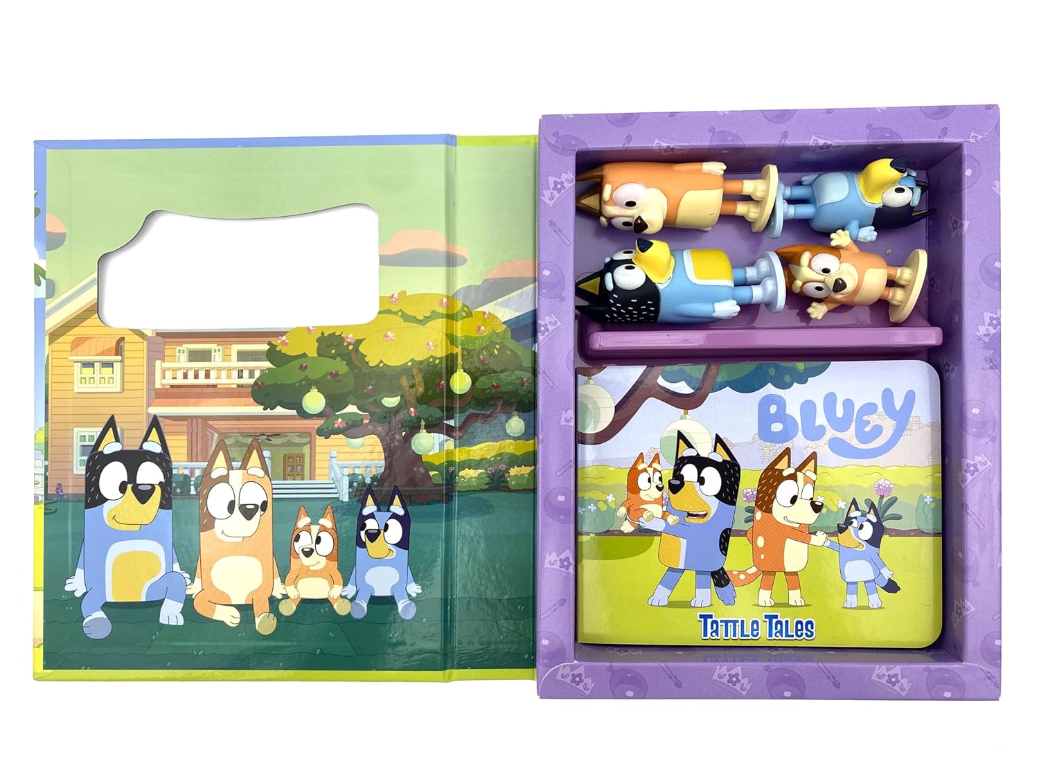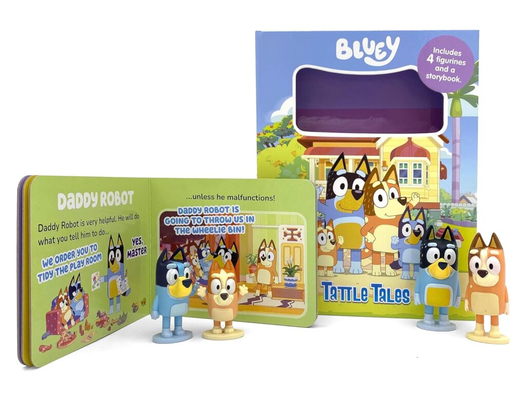 El Bluey Tattle Tales Libro Interactivo con Figuras 12 Páginas combina lectura y juego en una experiencia divertida e interactiva para los más pequeños. Este set incluye un resistente libro tipo board book y 4 figuras de personajes, perfectos para recrear la historia o inventar nuevas aventuras.