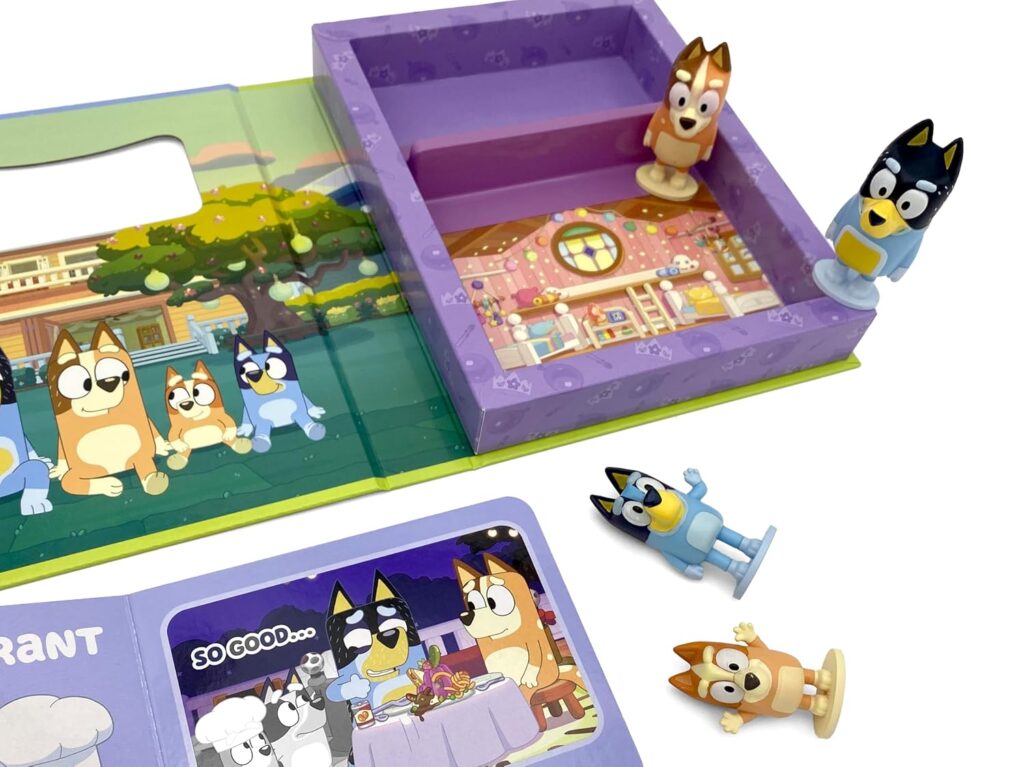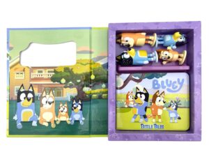 Libro interactivo de Bluey con 12 páginas y 4 figuras incluidas. Lee la historia y crea tus propias aventuras. ¡Diversión portátil para niños!