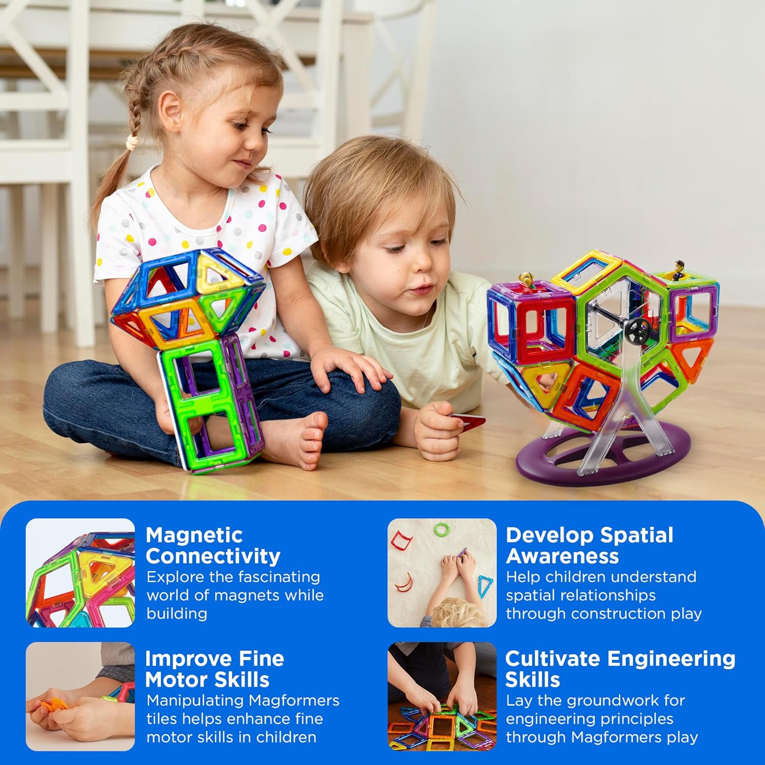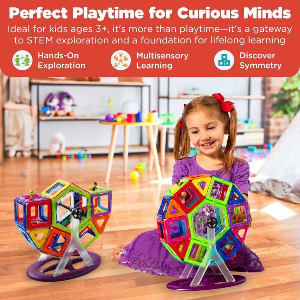 Crea tu propio parque de diversiones con este set magnético de 46 piezas. Incluye figuras geométricas y accesorios para construir atracciones mientras desarrollas habilidades STEM.