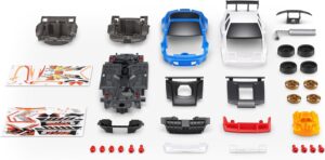 Incluye 2 carrocerías intercambiables y stickers para crear diseños únicos.