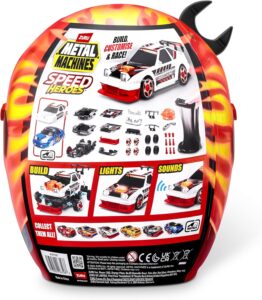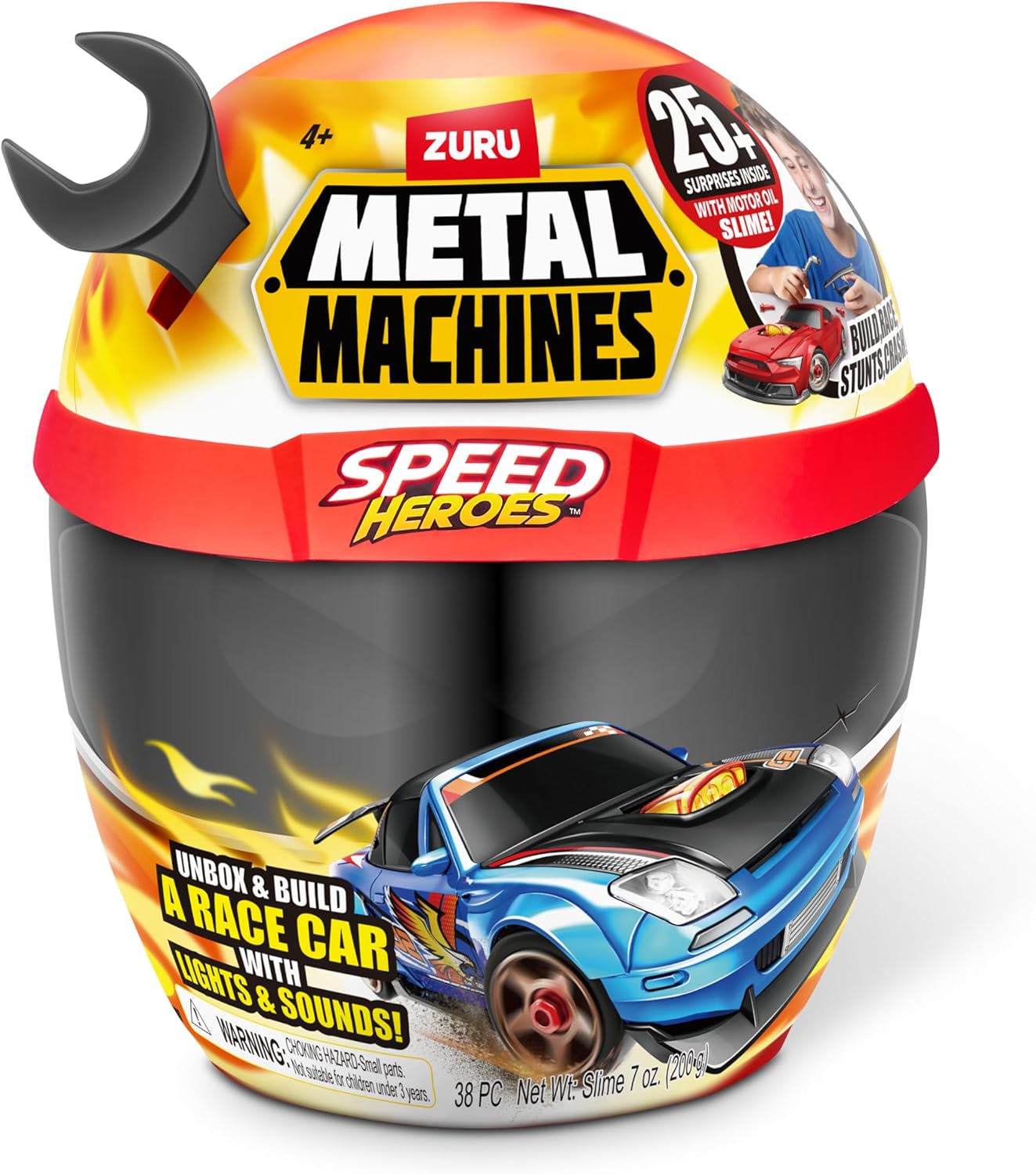 El Metal Machines Speed Heroes Black Zuru Set con 20+ Sorpresas combina emoción, construcción y sorpresa en un solo juguete. Rompe el casco para revelar todas las piezas ocultas y arma tu propio Speed Hero personalizado, listo para la acción.