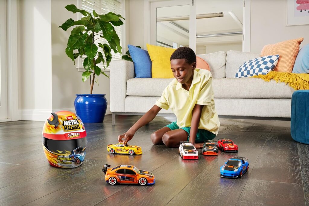 Niños y niñas que disfrutan autos, construcción y juguetes sorpresa llenos de acción.