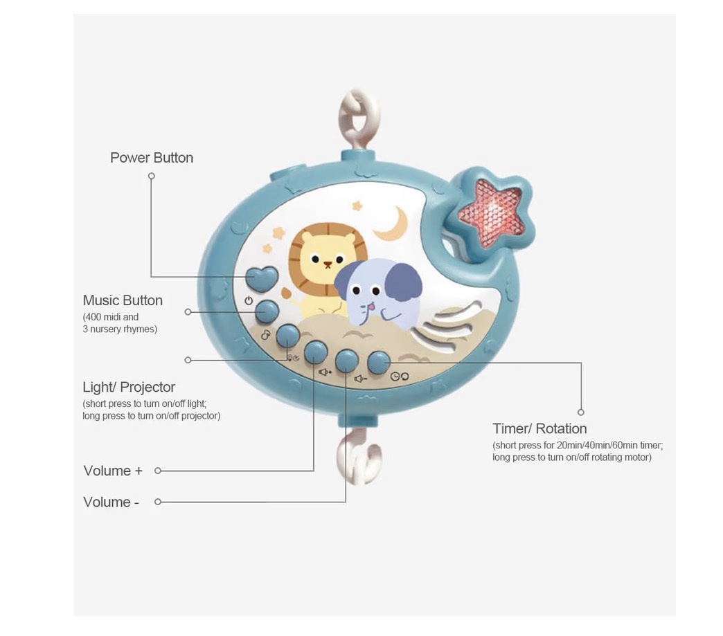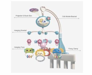 Móvil multifuncional para cuna en color Azul (Blue – Star), ideal para estimular, entretener y relajar al bebé. Compatible con cunas estándar y tipo “pack and play”.