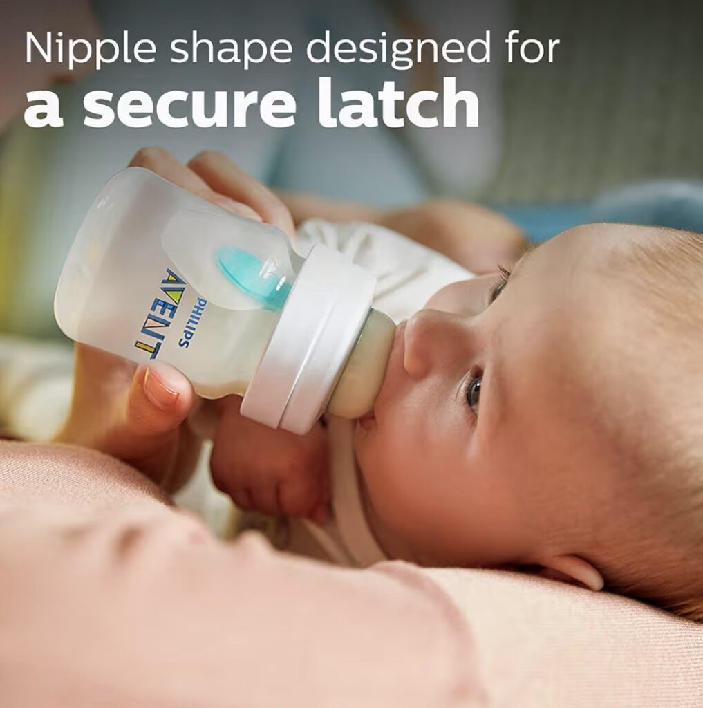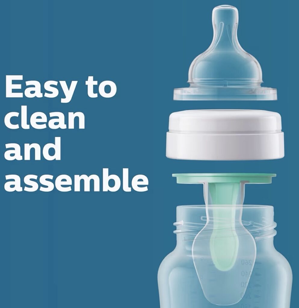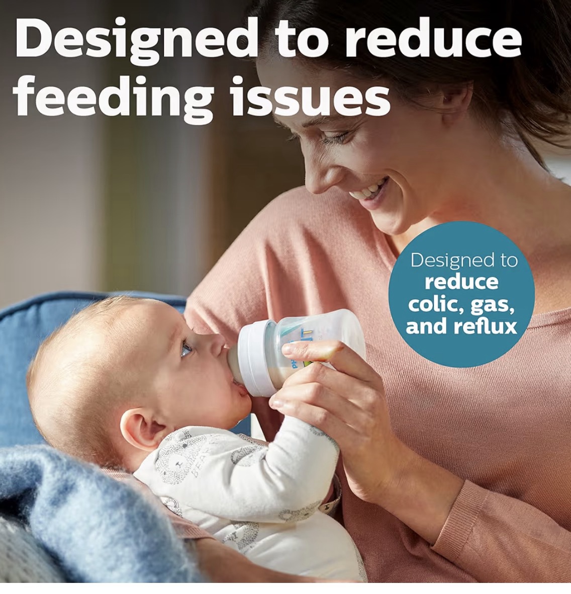 El biberón anticólicos Philips Avent con ventilación AirFree está diseñado para ayudar a reducir los problemas comunes de alimentación como cólicos, gases y reflujo, manteniendo la tetina llena de leche y no de aire durante la toma.