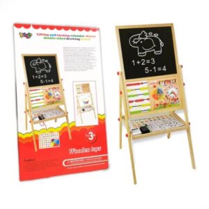 Este pizarrón educativo de doble cara es perfecto para que los niños aprendan jugando. Una cara funciona como pizarra negra para tizas, y la otra como pizarra blanca para marcadores. Incluye un ábaco de colores, reloj didáctico, letras, números y figuras geométricas. Su estructura de madera natural es resistente y segura, ideal para niños a partir de 3 años.
