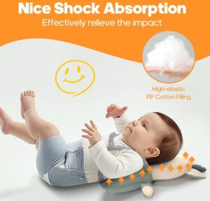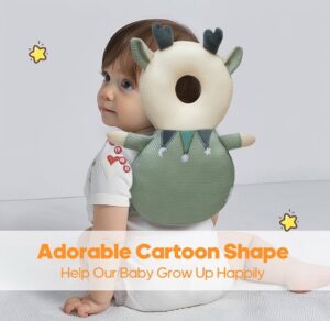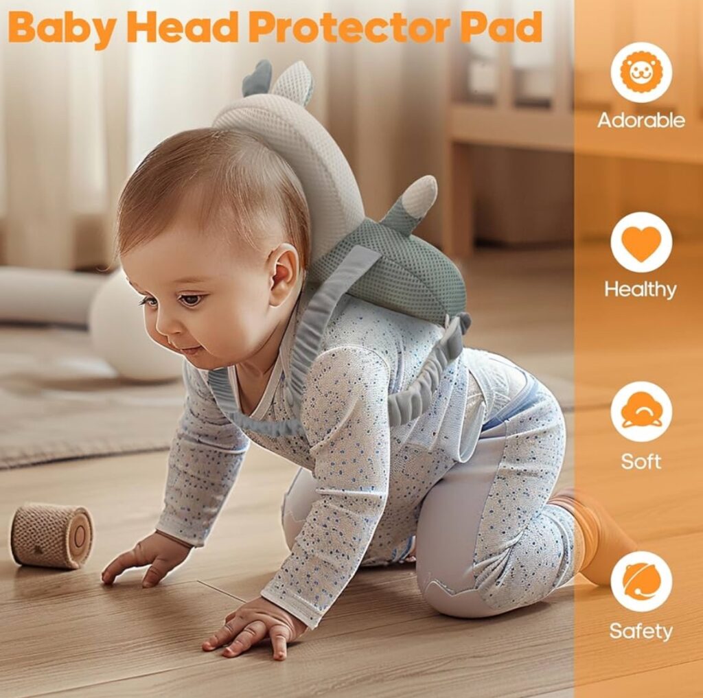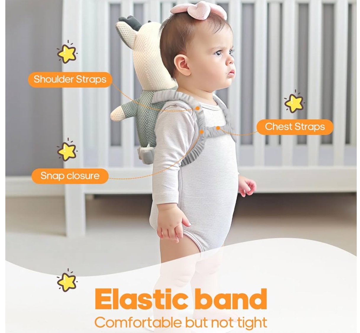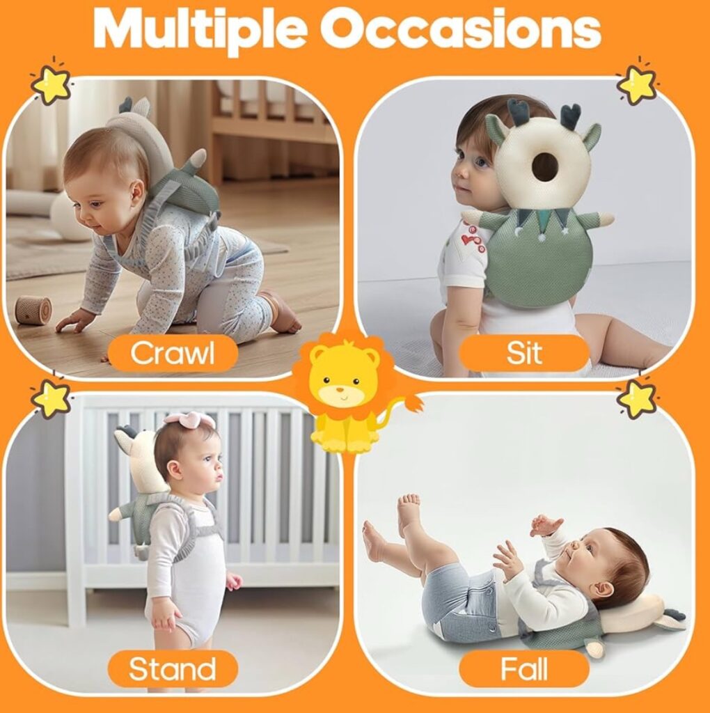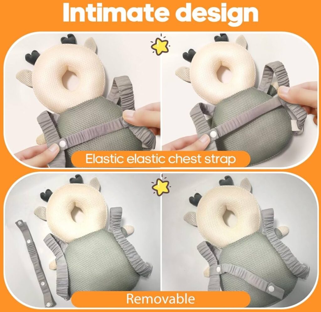 Protege a tu bebé mientras aprende a sentarse, gatear y caminar con este adorable protector de cabeza en forma de ciervito. Diseñado para amortiguar caídas y evitar golpes en la parte posterior de la cabeza y la espalda, brinda tranquilidad en cada etapa de crecimiento.