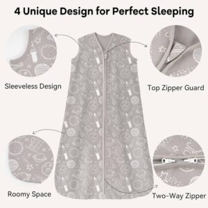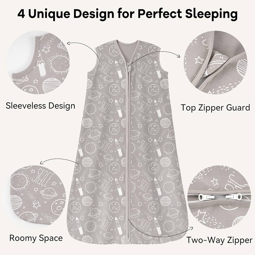 Saco de dormir para bebé 0-6 meses,100% algodón, ligero 0.5 TOG, con cremallera de 2 vías. Gris con planetas