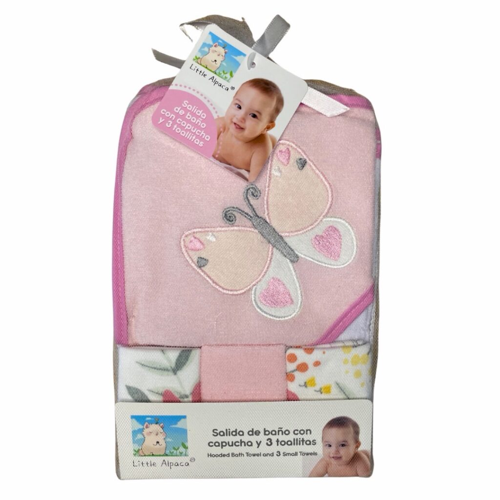 Salida de Baño para Bebé con Capucha 66×76 cm + Set de 3 Toallitas 20×20 cm – Toalla Suave y Absorbente para Recién Nacidos y Bebés, mariposa rosada