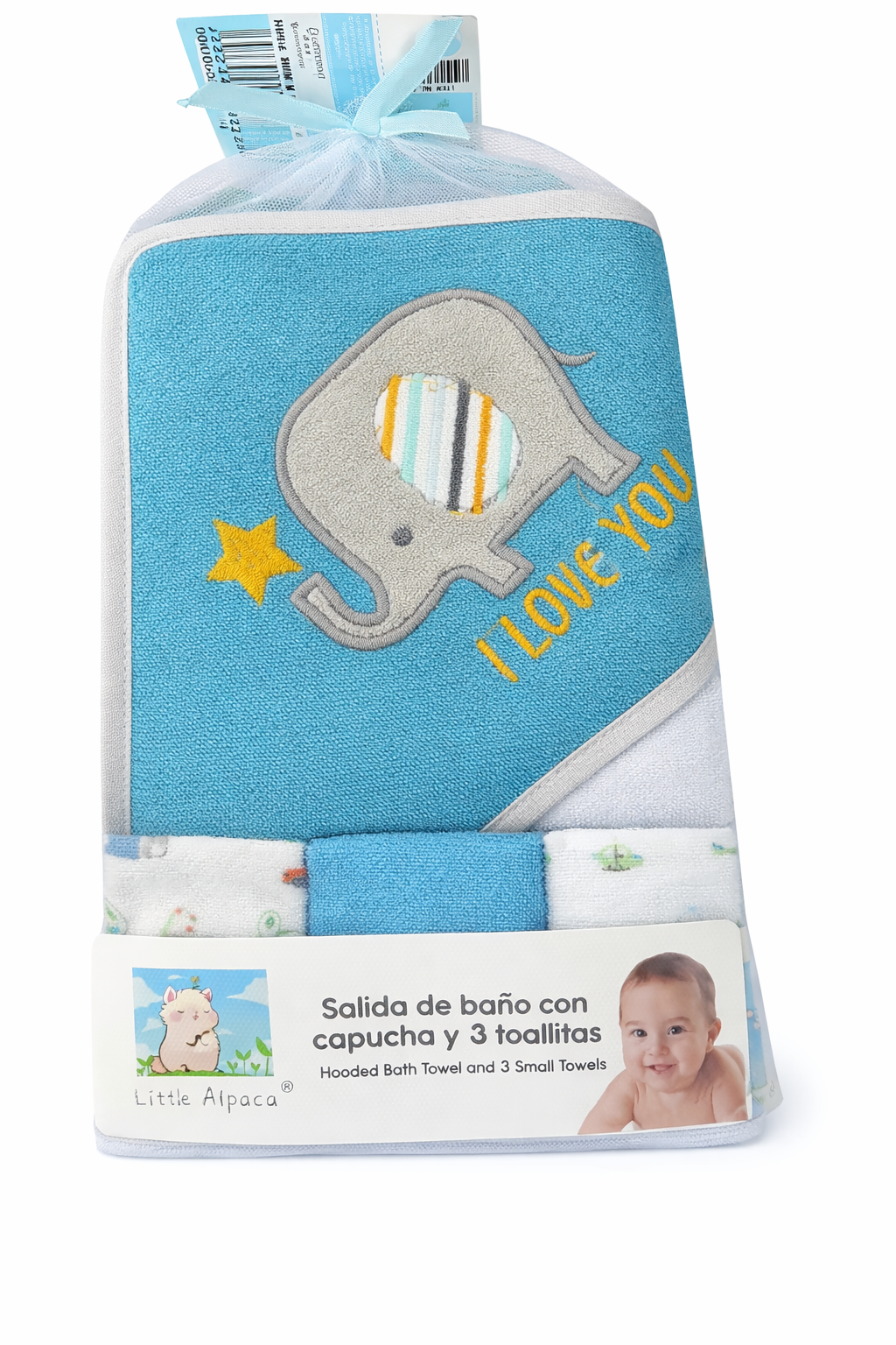 Envuelve a tu bebé en suavidad y comodidad después del baño con esta salida de baño con capucha, acompañada de 3 toallitas suaves, ideales para el cuidado diario de la piel delicada del bebé.