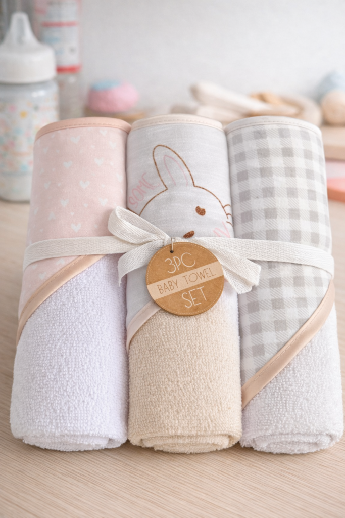 Este set de 3 salidas de baño con capucha es ideal para el cuidado diario del bebé después del baño. Diseñadas para brindar suavidad, absorción y confort, ayudan a mantener al bebé seco y abrigado desde el primer momento.