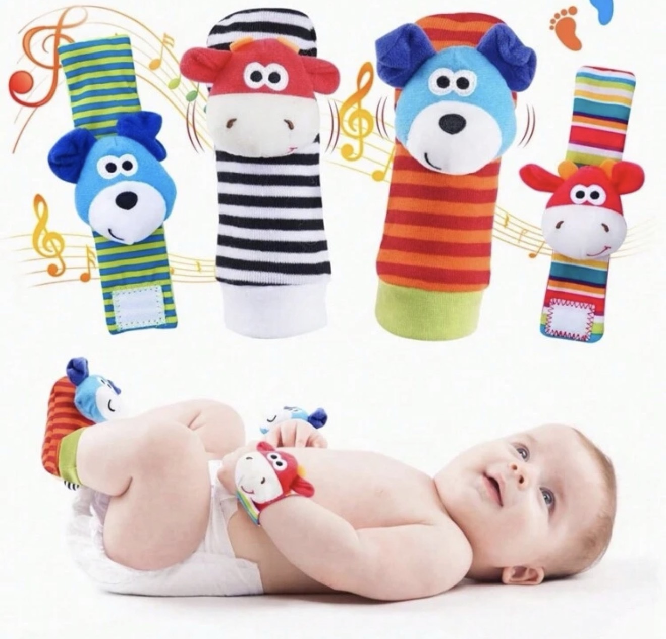 Este set de 4 sonajeros sensoriales (2 muñequeras + 2 calcetines) está diseñado para acompañar el desarrollo de tu bebé entre 0 y 6 meses, estimulando los sentidos de forma segura y divertida.