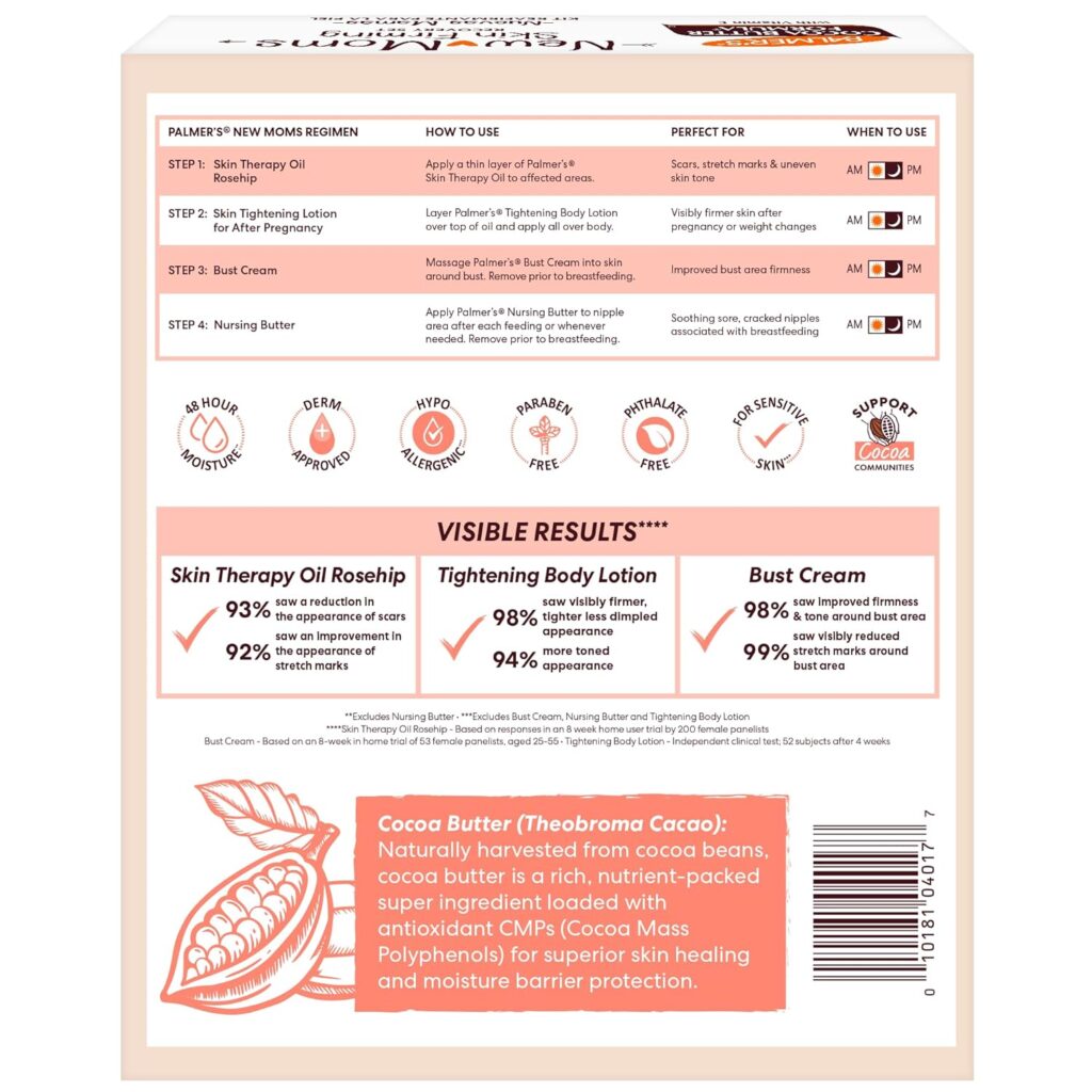 Set Palmer’s Cuidado Postparto para Mamá | Loción Corporal + Crema de Busto + Aceite para la Piel + Bálsamo para Lactancia