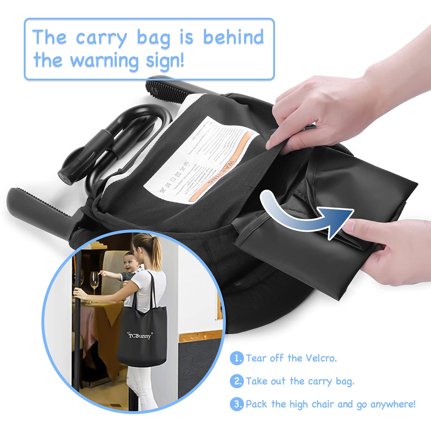 Cuenta con bandeja desmontable, perfecta para facilitar la alimentación y la limpieza, además de un cojín de asiento de PP y funda de tela Oxford impermeable, removible y lavable (a máquina o a mano). Su diseño compacto se pliega fácilmente y se guarda en la bolsa de transporte incluida, ocupando muy poco espacio.