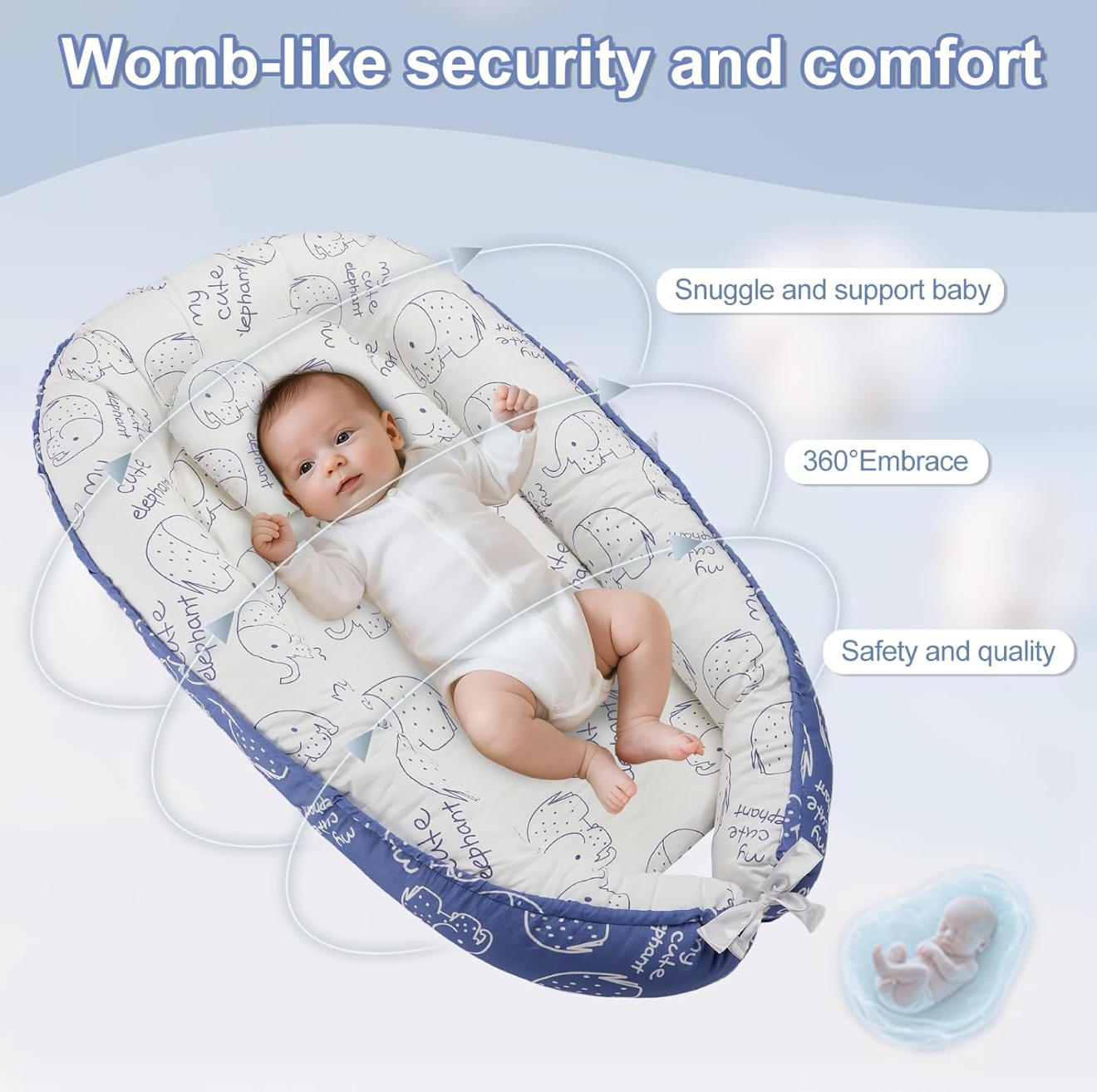 Tumbona o Nido Portátil para Bebé de 0-24 meses, 100% algodón – con Estampado de Elefantes Azul (85×50 cm)