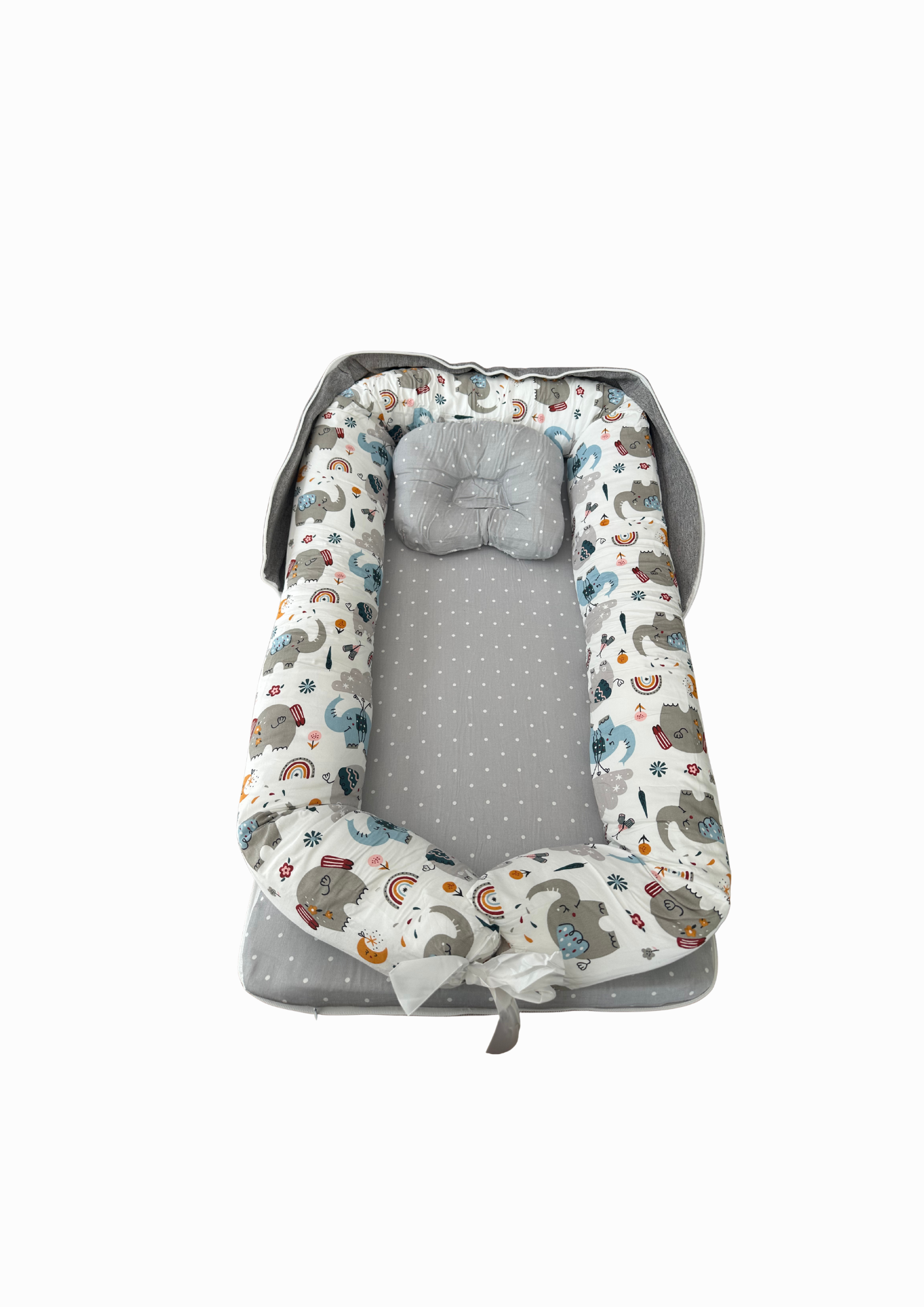 Tumbona o nido portátil plegable con zipper para bebé – Elefantes y arcoíris (78 cm x 48 cm)